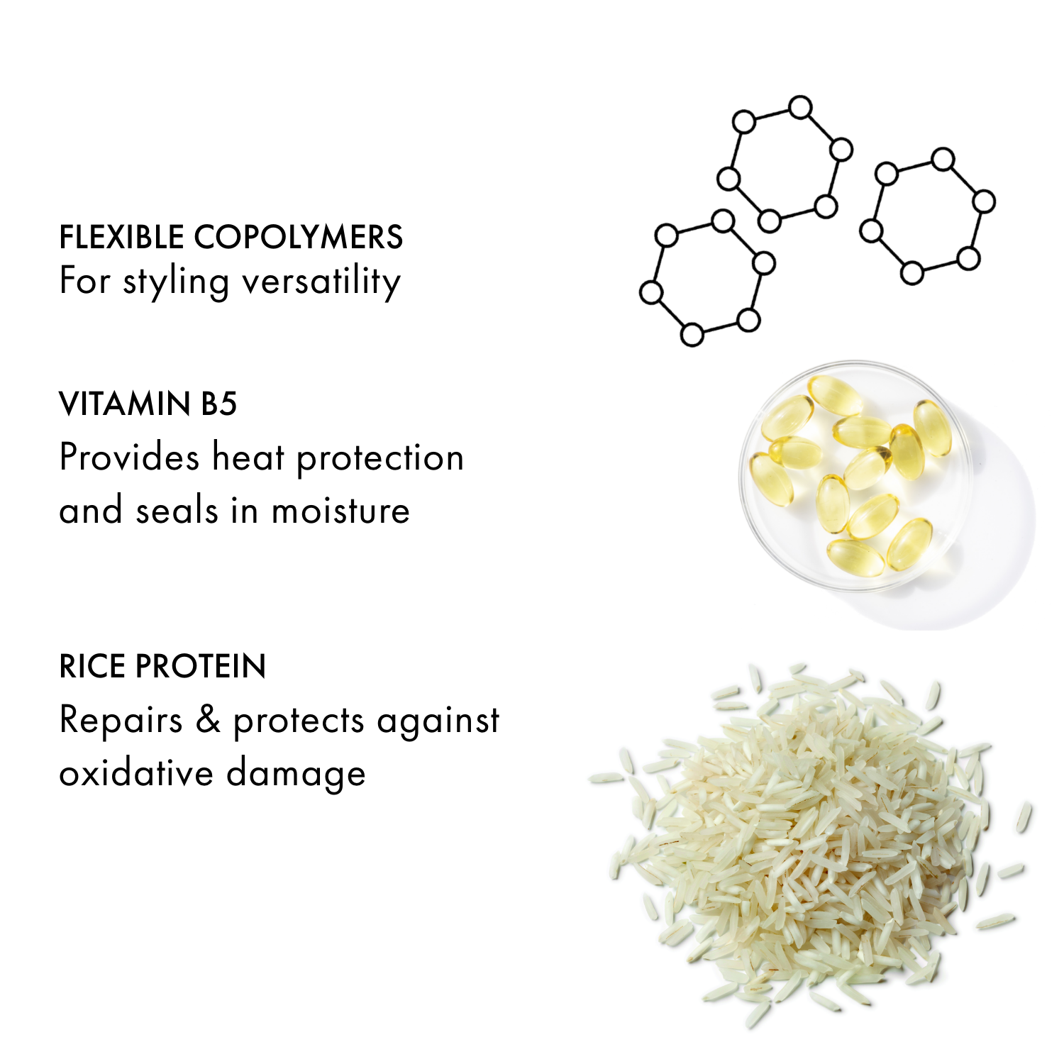 - Panthenol (Vitamin B5), a humectant which provides heat protection, seals in moisture by pulling water from the air and improving moisture retention.